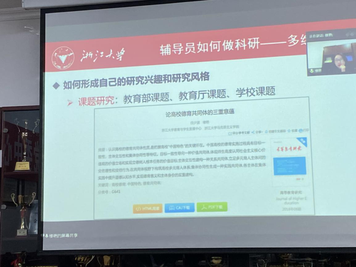 10月22日晚6:30,新葡的京集团35222vip学工队伍全体老师在二政三楼会议室参加系列培训,本次培训采用远程会议模式,由浙江大学继续教育公司党委书记楼艳教授为大家带来高校辅导员的科研与成长的培训。