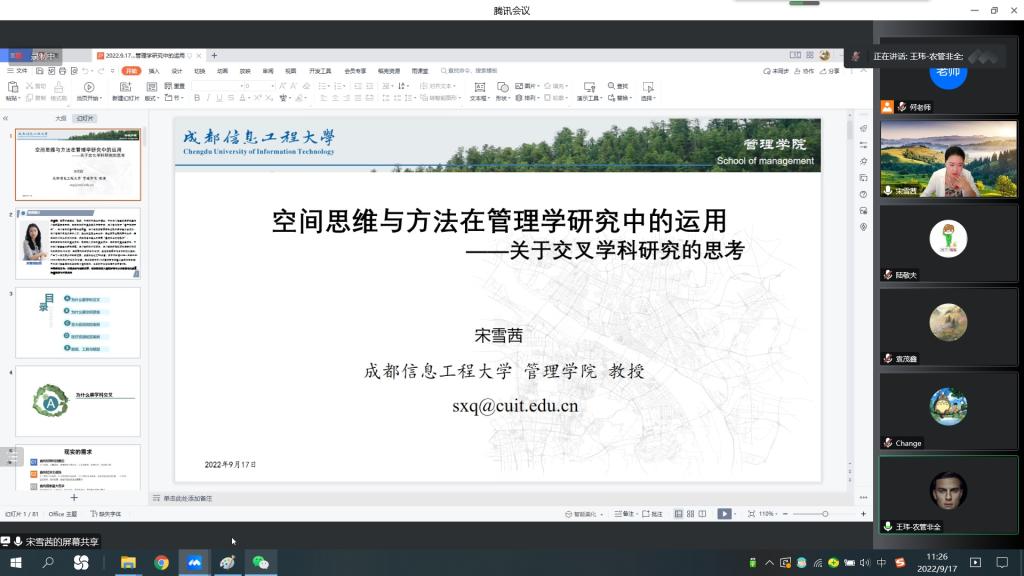 9月17日星期六上午,新葡的京集团35222vip经理宋雪茜教授在线上为公司2022级管理科学与工程、农业管理专业的研究生做了主题为《空间思维与方法在管理学研究中的运用——关于交叉学科研究的思考》的学术讲座。